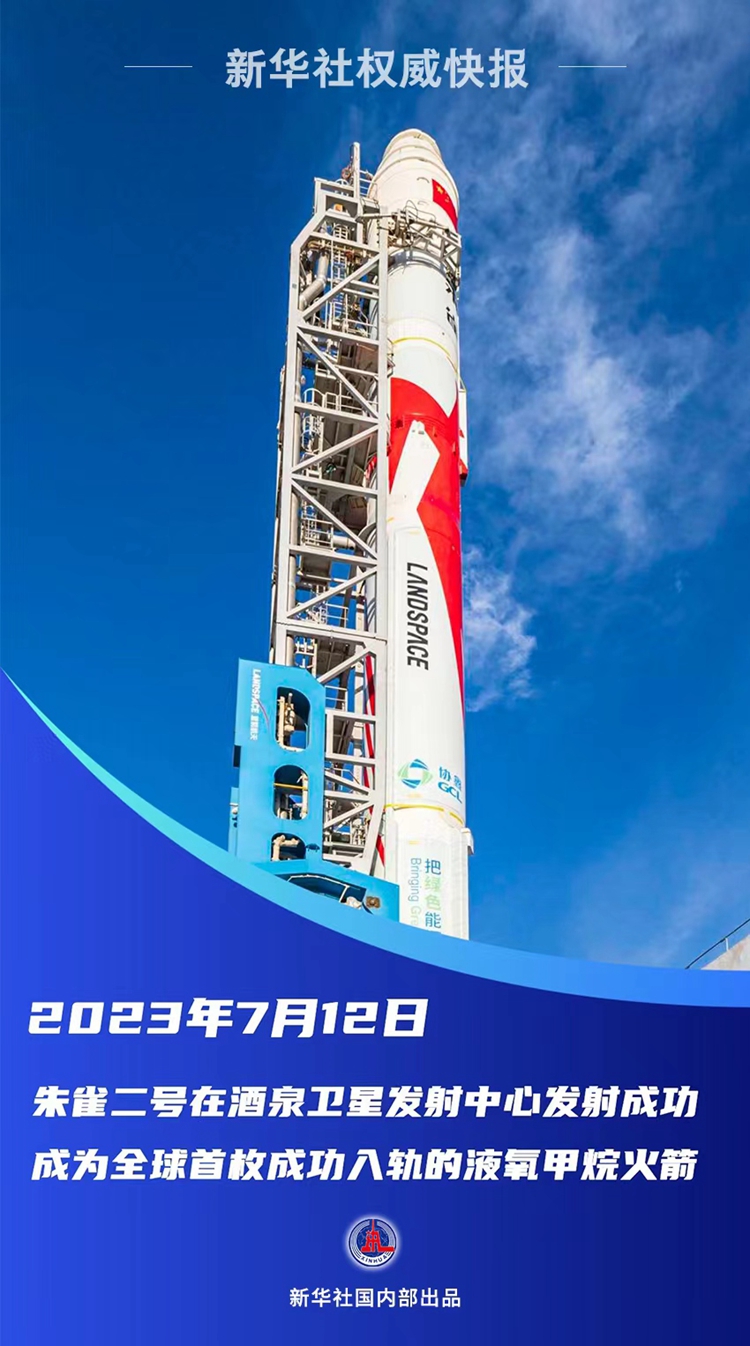 2023年7月12日上午,由蓝箭航天空间科技股份有限公司自主研制的朱雀二号遥二液氧甲烷运载火箭在酒泉卫星发射中心发射升空,火箭进入预定轨道,试验任务取得圆满成功。