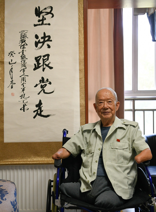 初夏的午后,记者来到四川省革命伤残军人休养院周全弟的家里,一进门就被墙上的书法作品所吸引,上书“坚决跟党走”五个大字,落款是“四肢截除壹级伤残军人周全弟抱笔书”。