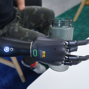 2019年6月6日,在位于杭州人工智能小镇的浙江强脑科技有限公司内,一名残障人士在试用人工智能手臂来抓握水杯。新华社记者 徐昱 摄