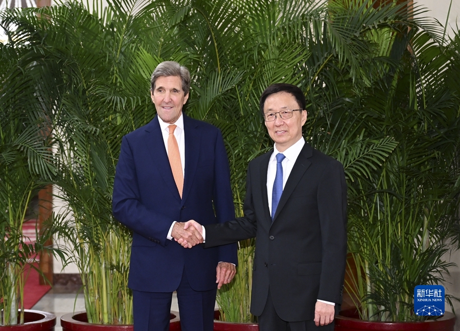 7月19日上午,国家副主席韩正在北京会见美国总统气候问题特使克里。新华社记者 张领 摄