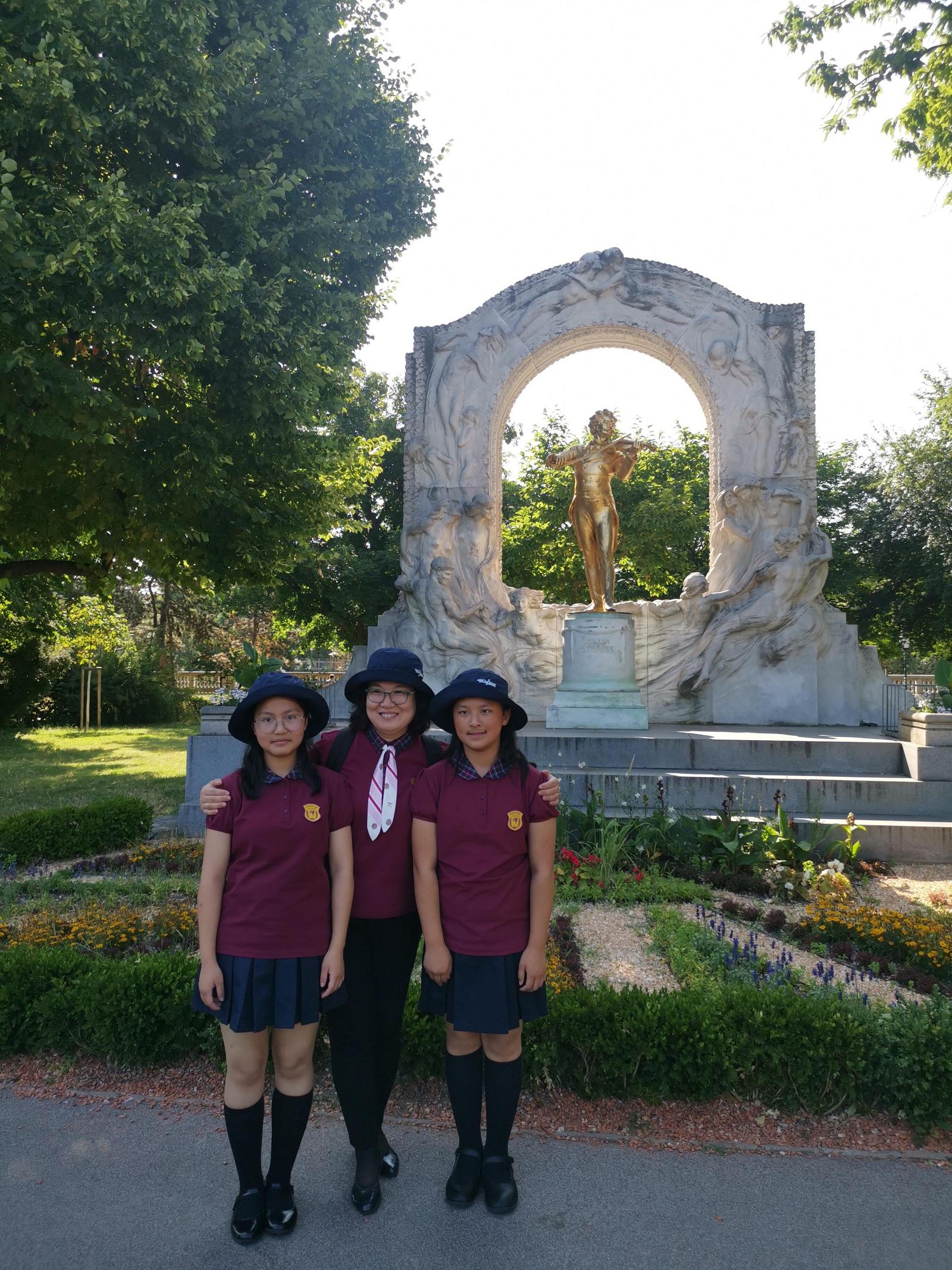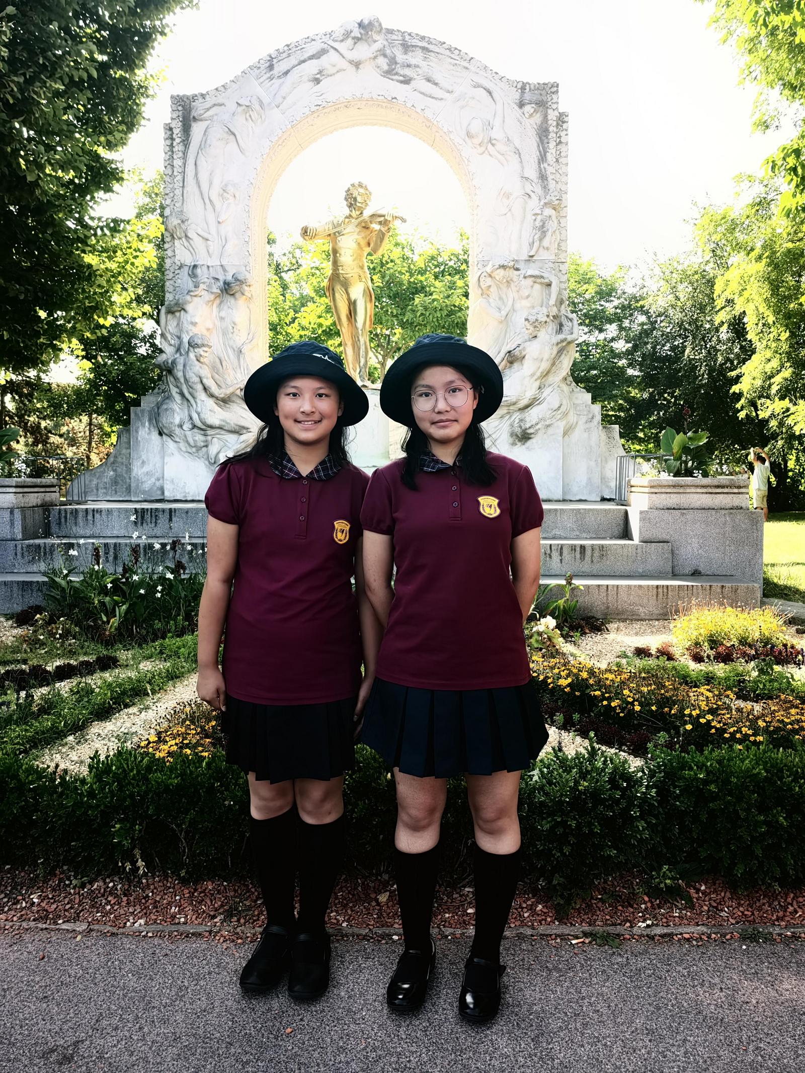 崔云蒙(右)和班琴在维也纳约翰·施特劳斯塑像前留影。