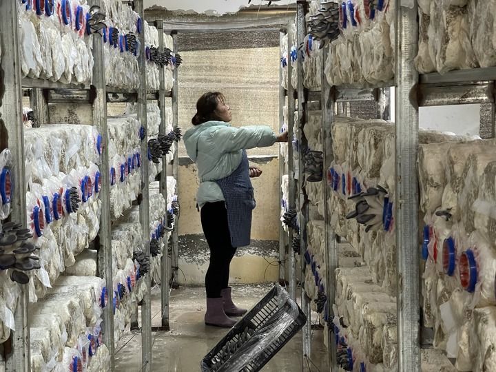 3月29日,贵州省晴隆县腾龙街道村民在采摘食用菌。新华社记者 骆飞 摄