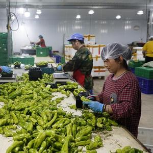 时值正午,屋外烈日当空,屋内一片凉爽。在恒温26摄氏度的分拣厂房中,工人们正修剪、挑选、打包,一盒盒包装精致的青椒、土豆等被送进物流箱,等待发货。