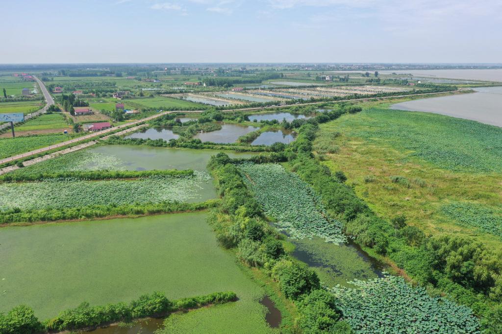 ↑这是7月10日在大通湖区河坝镇沙堡村拍摄的由中国科学院设计的大通湖流域农业面源污水末端强化处理设施(无人机照片)。