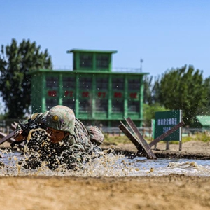 中部战区陆军第81集团军某旅“松骨峰特功连”进行单兵战术综合演练,官兵们快速通过涉水场(2023年6月9日摄)。新华社发(姜慧鑫 摄)
