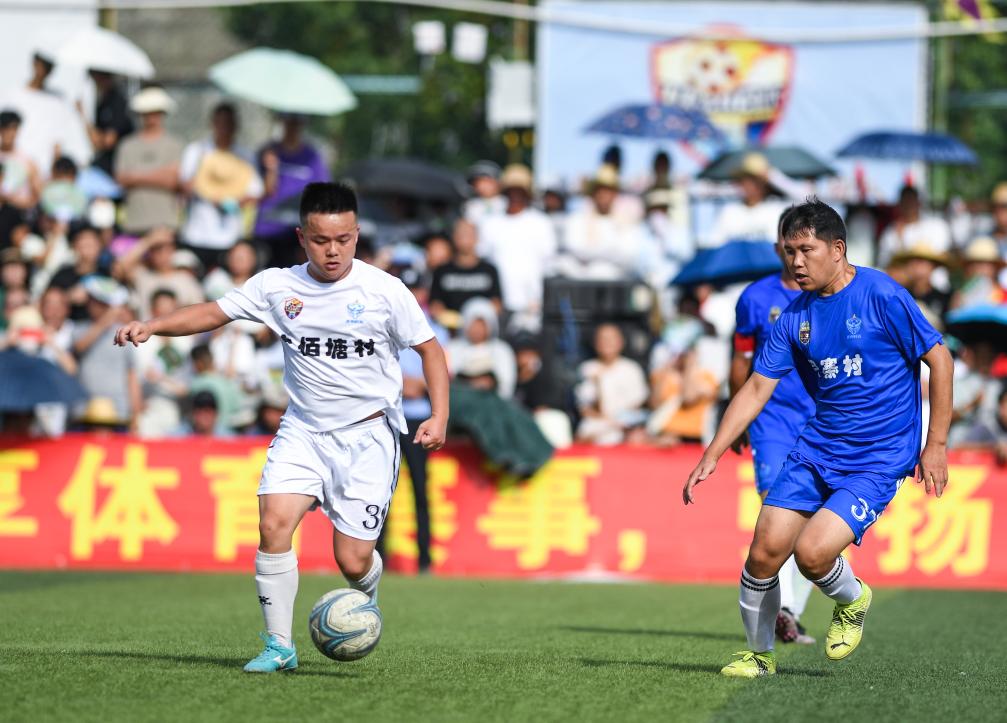 7月15日,六佰塘村足球队球员杨宗维(左)在与月寨村足球队的比赛中带球进攻。新华社记者 杨文斌 摄