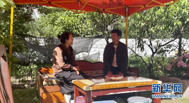 图为嘎拉村村民达瓦参坚和妻子在自家的院子里聊天,身后是小菜园和不同的果树。新华网 陈颖 摄