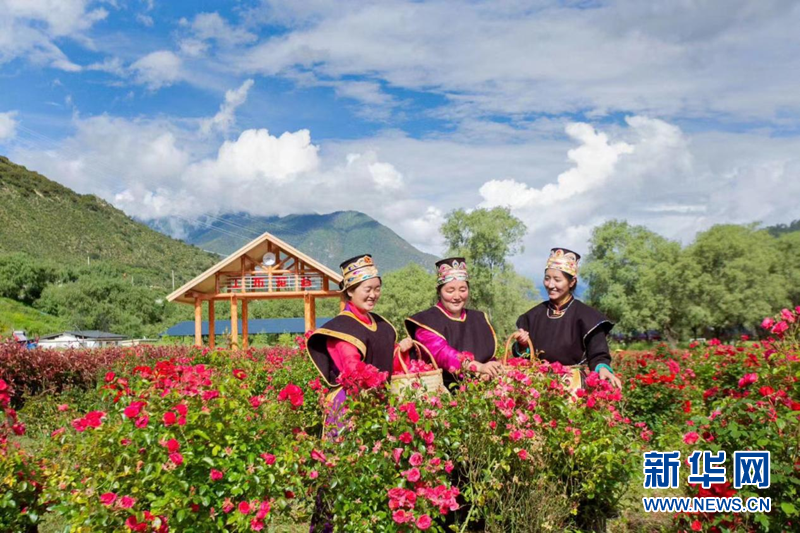 图为当地村民在工布花谷玫瑰种植园内采摘玫瑰花朵。 (工布花谷 李磊 供图)