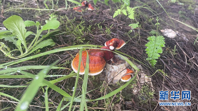 图为红太阳科技示范家庭农场的种植棚内,仿林下野生环境种植的灵芝。新华网 陈颖 摄