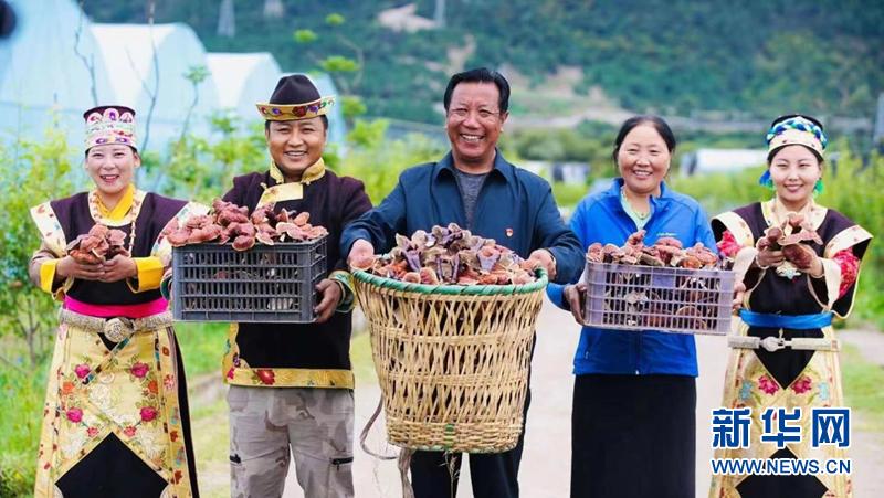 图为红太阳科技示范家庭农场创始人尼玛带着村民庆祝灵芝丰收。(红太阳科技示范家庭农场供图)