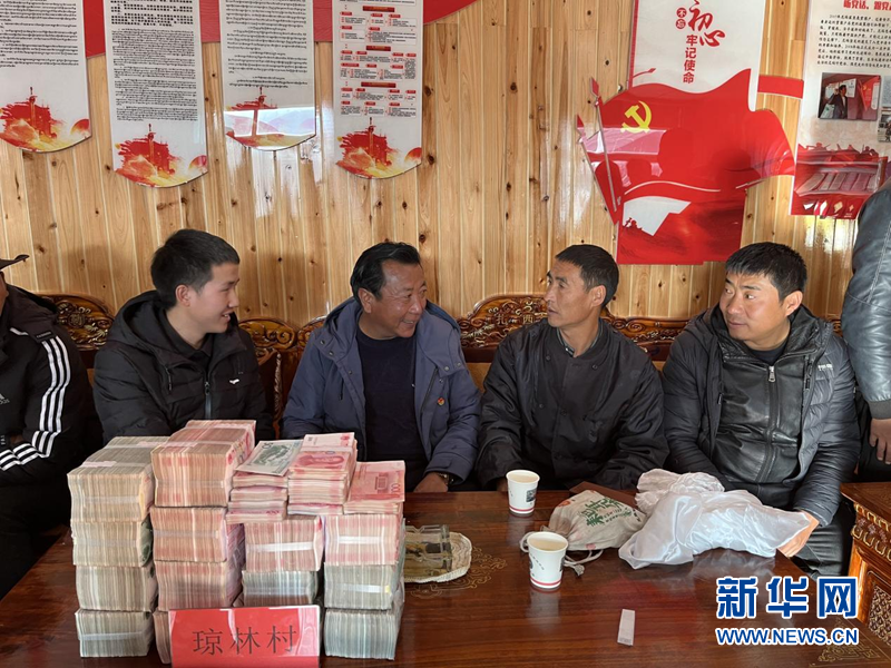图为红太阳科技示范家庭农场向周边乡镇村代表回购种植的灵芝并支付现金。(红太阳科技示范家庭农场供图)