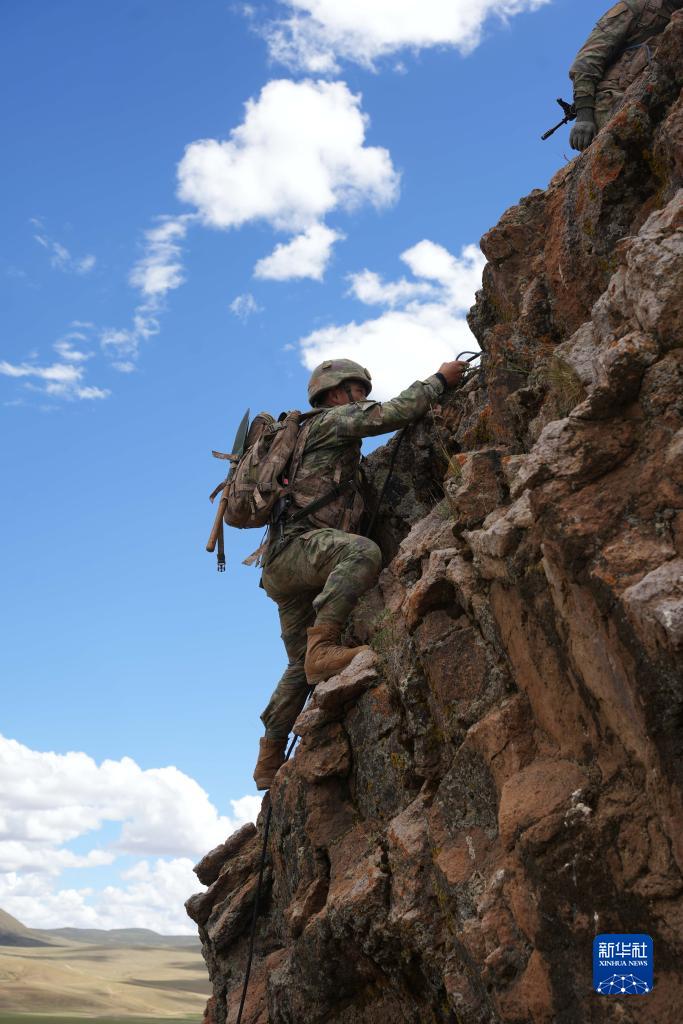 西部战区陆军某旅“罗盛教连”在海拔4500米高原组织攀登训练(6月27日摄)。新华社发(王治钦 摄)