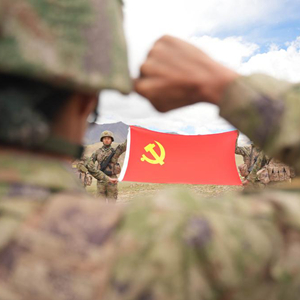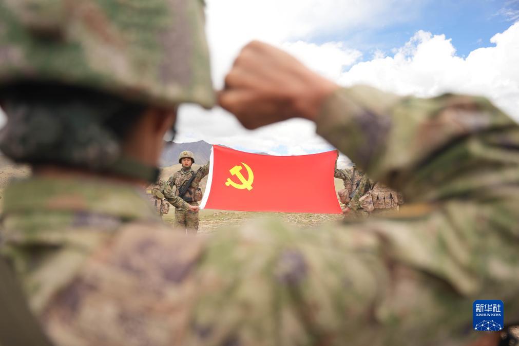 西部战区陆军某旅“罗盛教连”官兵在海拔4500米高原向党旗宣誓(6月30日摄)。新华社发(王治钦 摄)