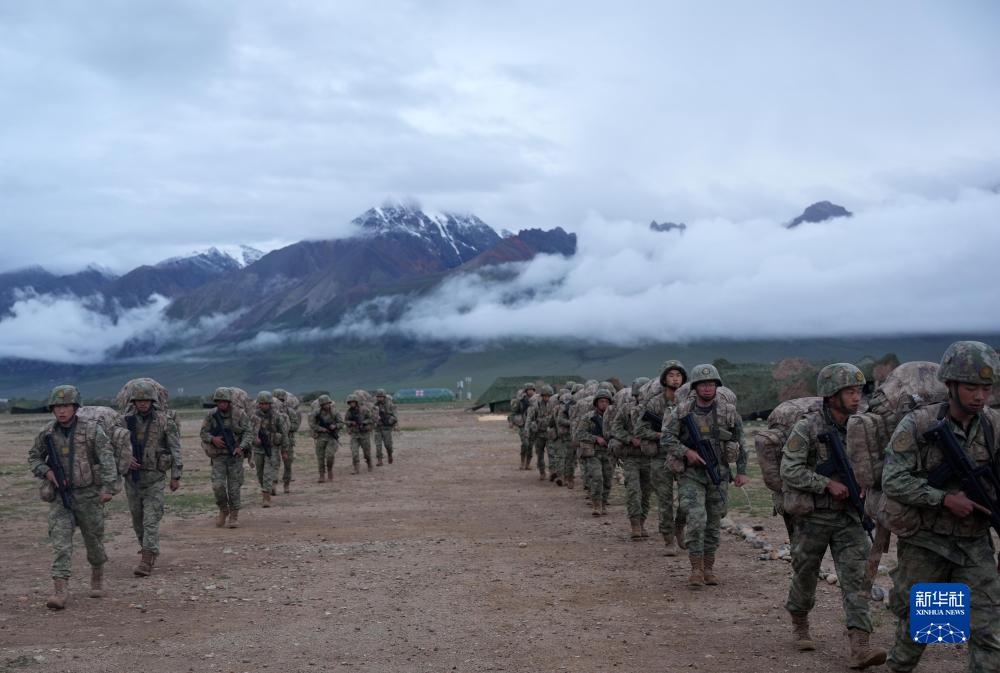 西部战区陆军某旅“罗盛教连”在海拔4500米高原组织长途拉练(7月14日摄)。新华社发(王治钦 摄)