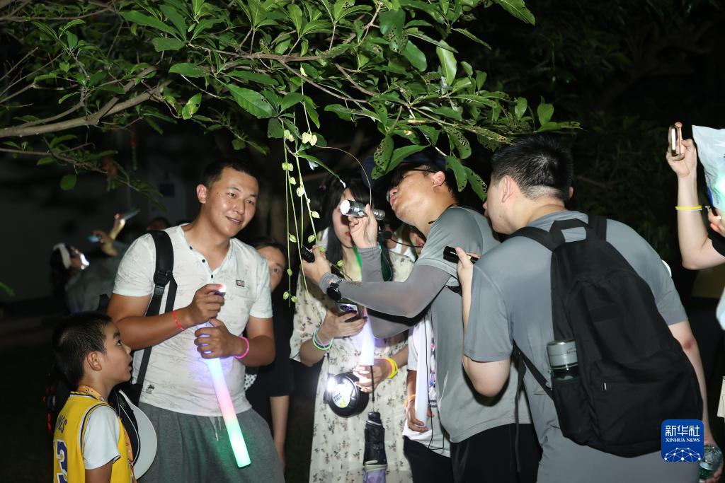 7月28日,粤港澳三地青少年在老师的指导下夜游植物园,了解植物奥秘、寻访夜行性昆虫。新华社发