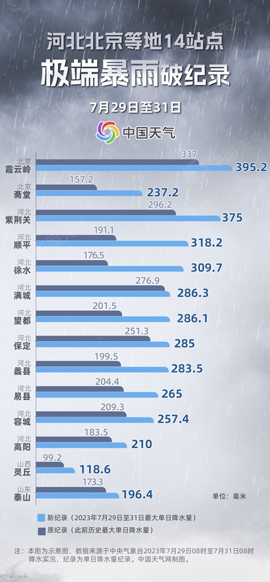 据中国天气网气象分析师石妍介绍,截至今天8时,这轮降水过程华北、黄淮共计14个国家气象观测站日降水量突破历史极值,分别是北京霞云岭、斋堂,河北保定、望都、徐水、满城、易县、紫荆关、蠡县、顺平、容城、高阳,山西灵丘和山东泰山。