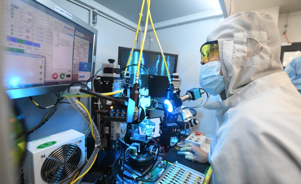 武汉光迅科技股份有限公司生产车间内,技术人员在光模块生产线作业。新华社记者程敏 摄