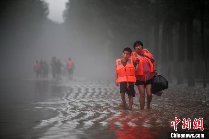 入目处,京白路塔照村段前方洪水已漫过路面,普通车辆无法前行,不时有救援人员护送民众转移到安全的地方。