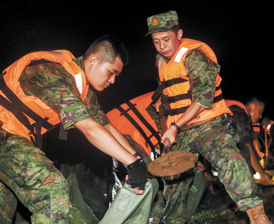 近日,河北省涿州市境内河流水位暴涨,发生超警洪水。第82集团军某旅接到上级命令,紧急前出执行防汛救灾任务。图为该旅官兵彻夜加固堤坝。邓青华摄