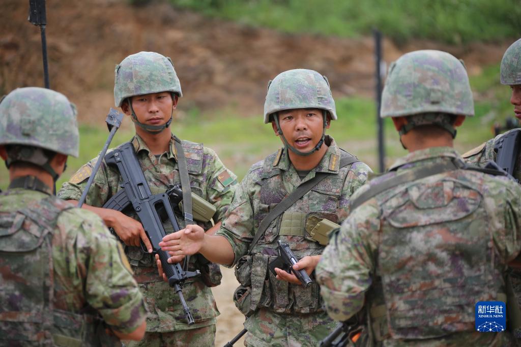 陆军第71集团军某旅“济南英雄连”连长孙金龙(左三)向战友传授射击技巧(6月29日摄)。新华社记者 张永进 摄