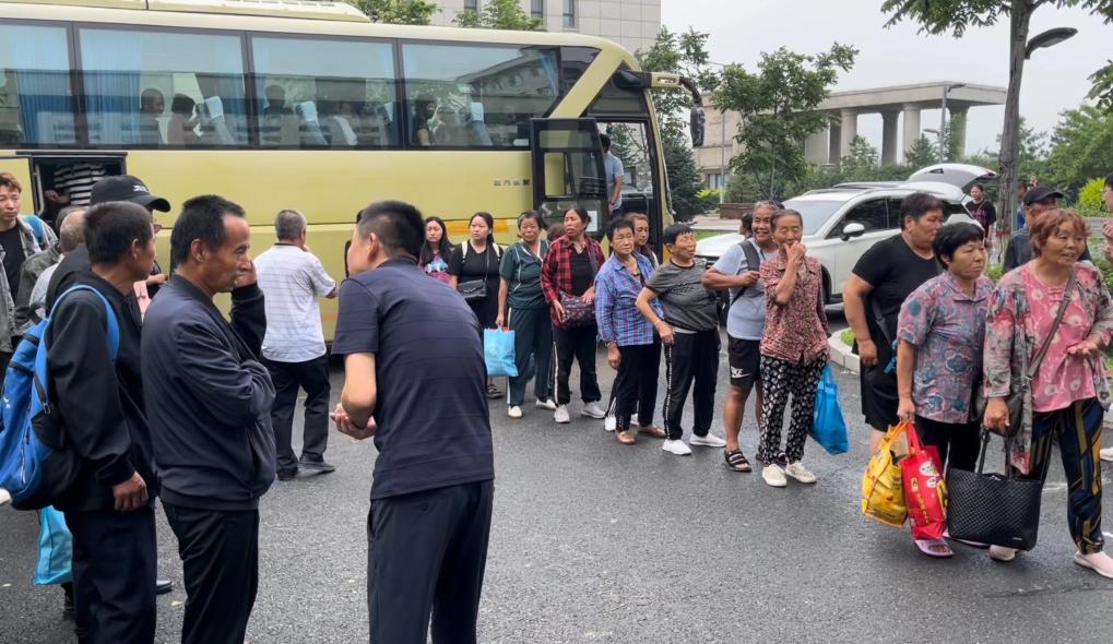 8月4日,转移安置群众乘大巴车来到五常市雅臣中学安置点。新华社记者 刘昊东 摄