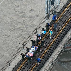 就在我刚刚走到连接陇驾庄村和水峪嘴村的桥上,迎面遇到一行人。他们拎着行李背着包,神情疲惫,不少人脚上沾着污泥,队伍中有几个武警战士。直觉告诉我,这应该就是从受困列车里转移出来的旅客。