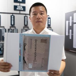 8月5日,在黑龙江省牡丹江市举办的侵华日军细菌战罪证陈列展上,研究人员展示《日军哈尔滨第一陆军病院原薄》(影印件)。新华社记者 张涛 摄