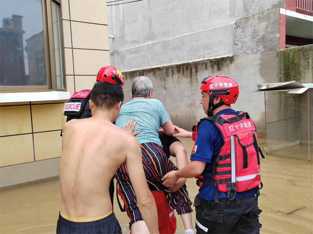 救援人员转移被困者。(山西省介休市红十字救援队供图)