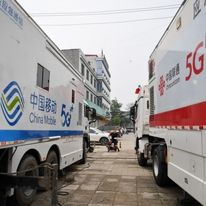 8月3日,应急通讯车辆停靠在河北省涿州市第三中学安置点外。新华社记者 牟宇 摄