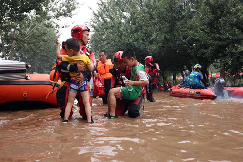 △8月3日,河北涿州北二环附近,山东消防救援人员抱着孩子通过积水路段。
