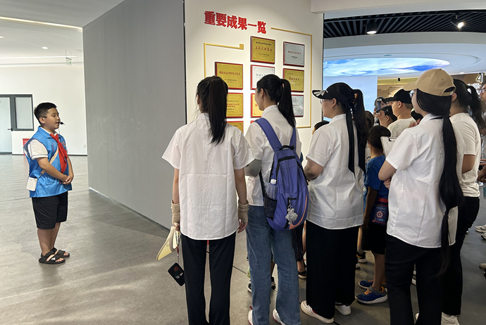 7月11日,小讲解员为观众介绍水库发展史。新华网记者 刘威 摄