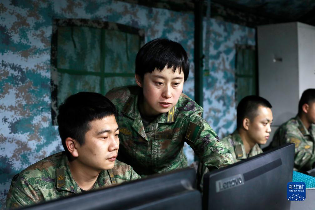 战略支援部队某信息通信团政治工作处副主任赵丽(中)对学兵进行信息通信业务指导(6月8日摄)。新华社发(刘绍彤 摄)