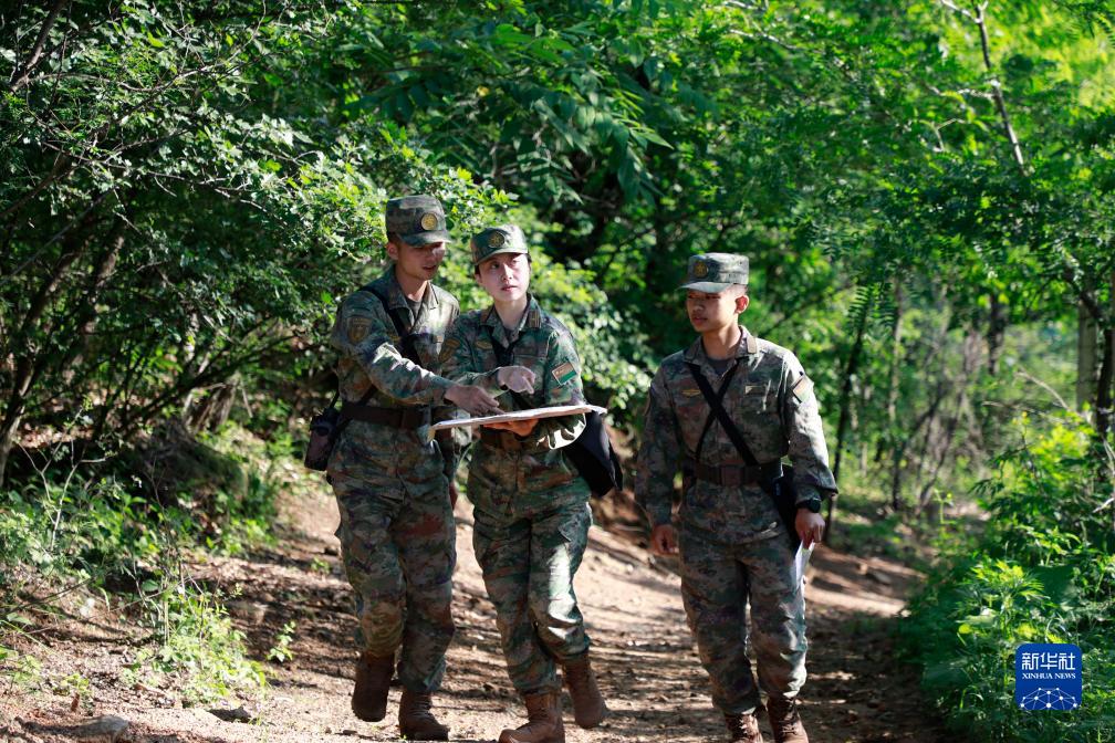 战略支援部队某信息通信团政治工作处副主任赵丽(中)与战士一起进行定向越野课目训练(6月8日摄)。新华社发(张家军 摄)