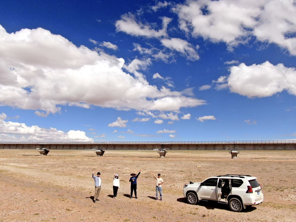 2021年7月7日,王金金(左二)在可可西里索南达杰保护站附近采访。新华每日电讯记者 张龙 摄