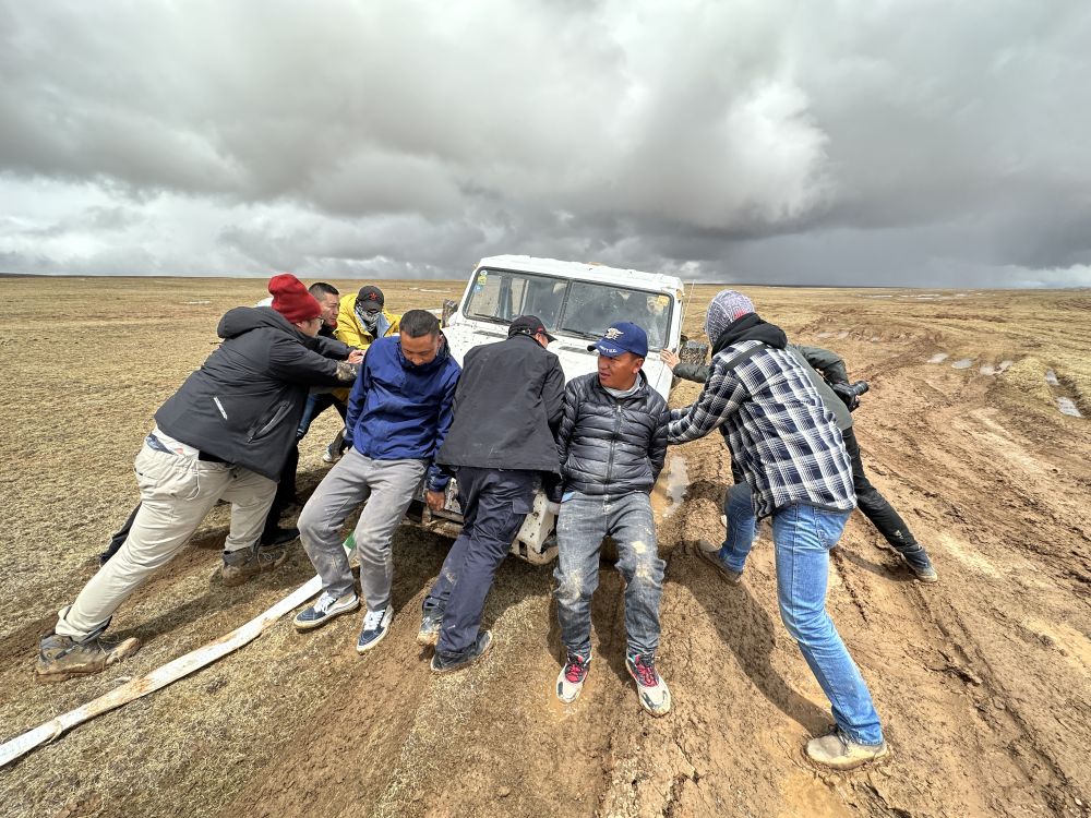 两次前往卓乃湖都是夏天,原本的冻土和沼泽融化成一个个烂泥滩,车辆陷在泥里,动弹不得。望着眼前的车辙,工作多年的巡山队员才索加想起了距离死亡最近的一次巡山。