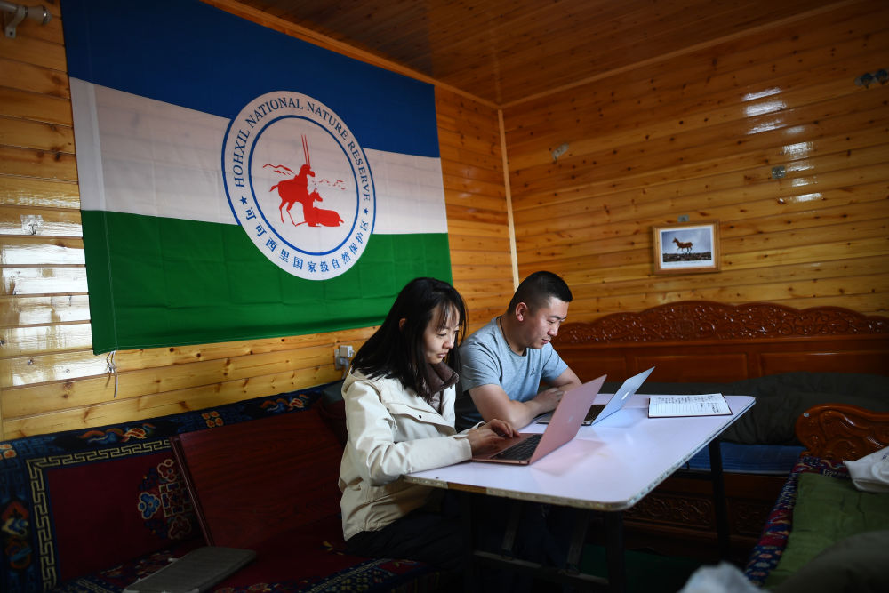 6月16日,王金金(左)在可可西里卓乃湖保护站出镜。新华每日电讯记者 张宏祥 摄