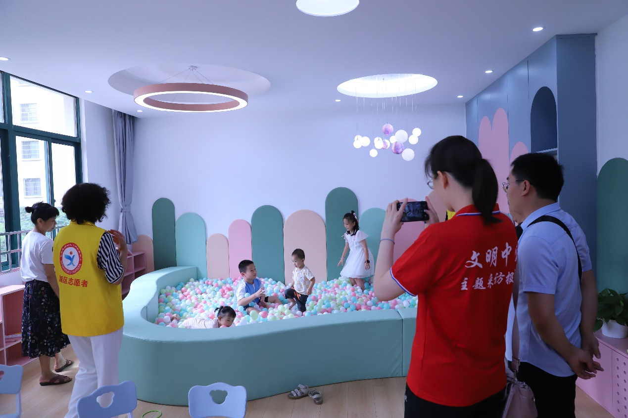 7月19日,志愿者在西湖区新时代文明实践中心照看儿童。(地方媒体供图)