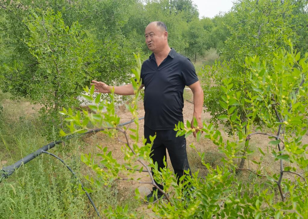 任二换在乌兰哈少嘎查荒漠治理区查看酸枣树长势。(新华社记者 李云平 摄)