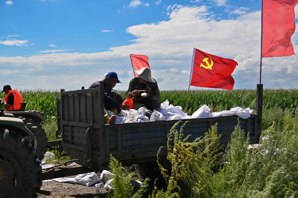 村民刘忠迎驾驶着自家的拖拉机往坝上运沙袋,每天从早干到晚,往返十几趟。“白天运完沙袋,晚上我还要再次出发,去巡查堤坝。”刘忠迎说,“我们种畜场的都是一家人。”