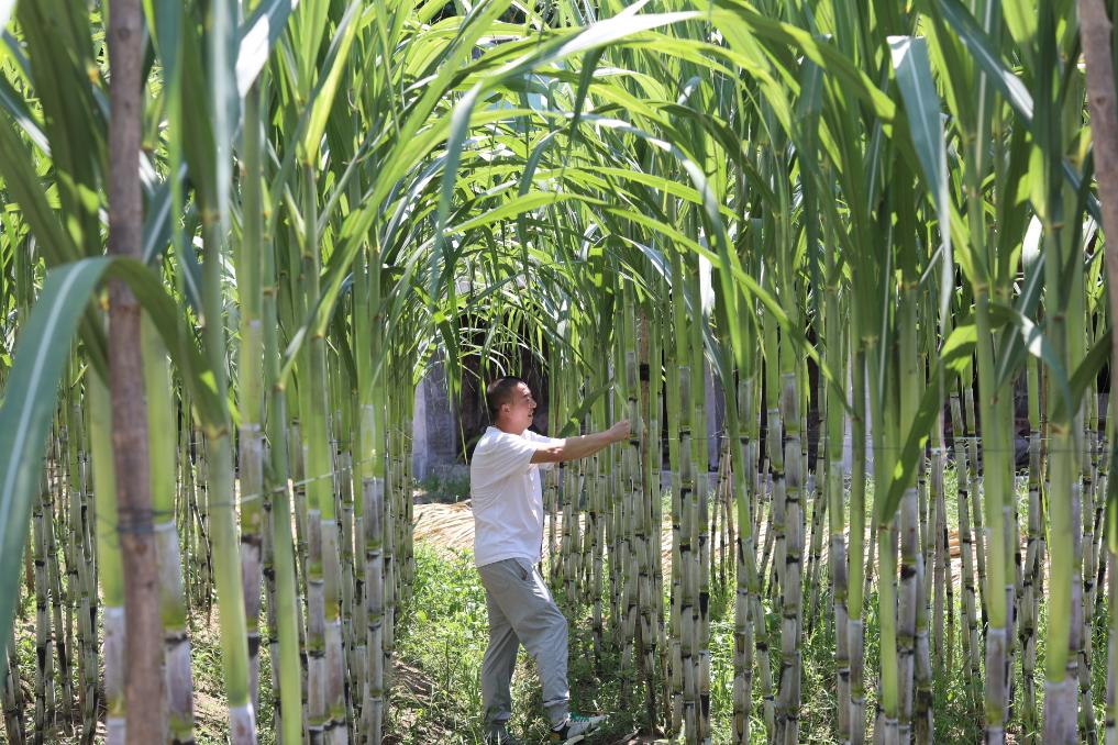 赵良露在自家地里查看甘蔗长势。新华社记者刘梓桐 摄