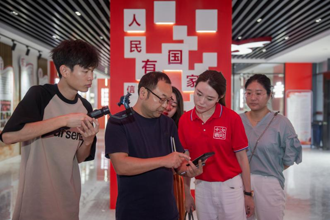 7月24日,湖北省荆门市东宝区新时代文明实践云平台工作人员在向采访报道组展示志愿服务系统。新华网 钟奕 摄