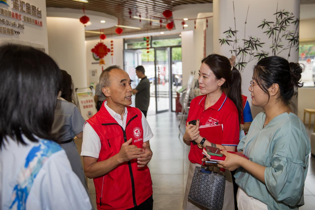 7月25日,采访报道组采访湖北省宜昌市伍家岗区大公桥街道金家台社区居委会志愿者陈实(左二)。新华网 钟奕 摄