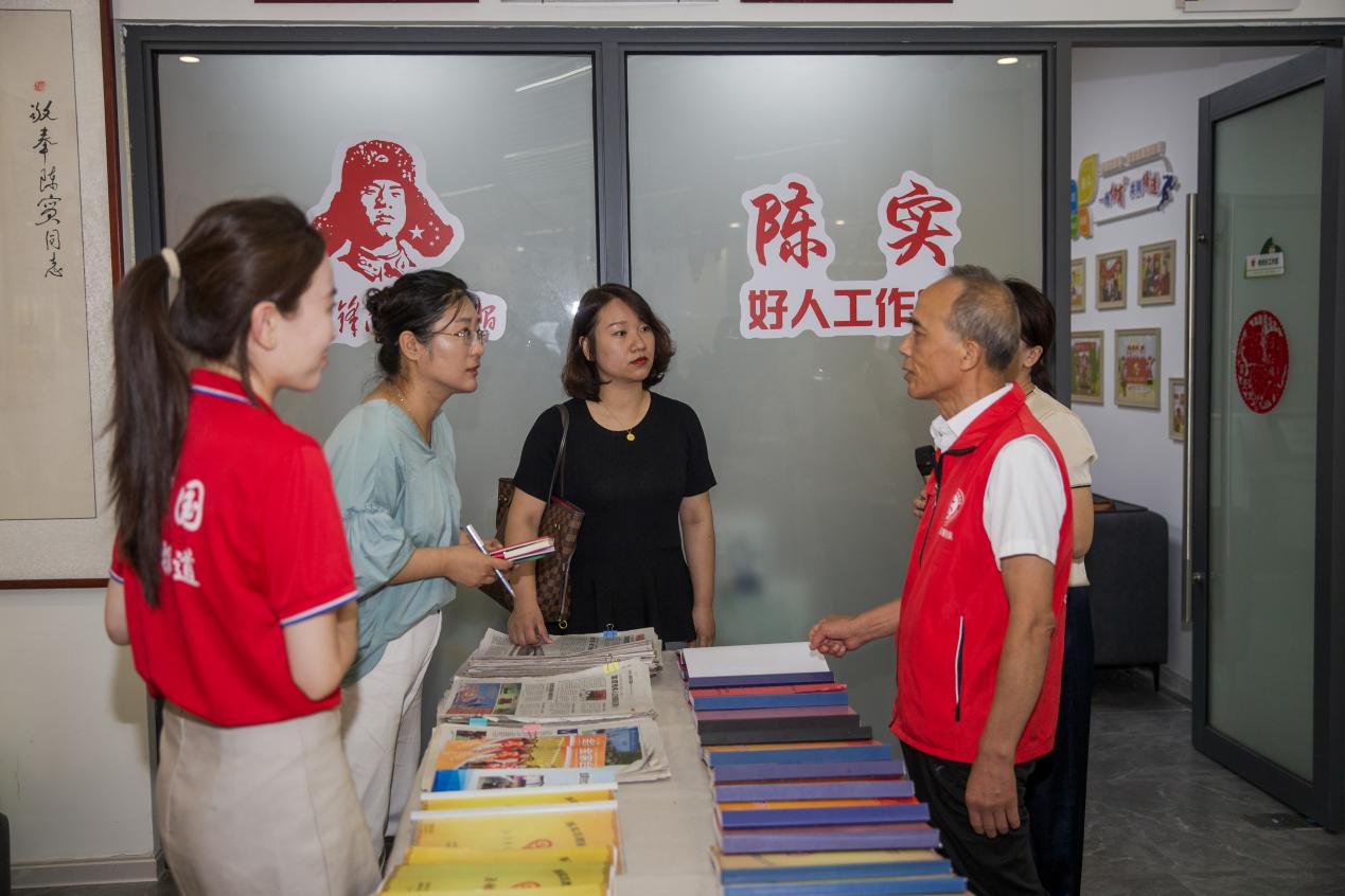 7月25日,采访报道组采访湖北省宜昌市伍家岗区大公桥街道金家台社区居委会志愿者陈实(右二)。新华网 钟奕 摄