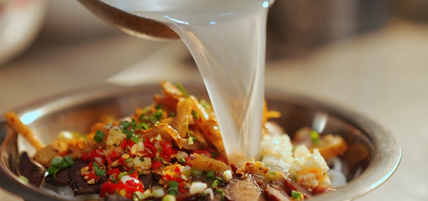 洁白滑嫩的米粉淋上油汪汪 馥香的卤水