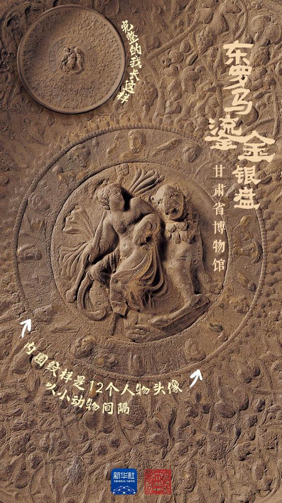 男子持杖倚兽、12个人物头像活灵活现、葡萄卷草纹相互勾连,这件出土于甘肃靖远的鎏金银盘,是典型的东罗马风格器物,现藏于甘肃省博物馆。有学者认为,银盘中心浮雕男子是希腊神话中的酒神狄奥尼索斯,而银盘内壁主体图案,正是通常用来表现酒神的葡萄纹。甘肃省博物馆副馆长班睿介绍,该器物属东罗马帝国产品,经丝绸之路长途贩运至中国,是中西文化贸易交流的重要实物见证。