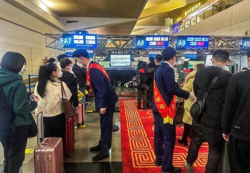 2023年1月7日,厦门航空集团志愿者在T3候机楼开展文明旅游、文明值机志愿服务活动。(地方媒体供图)