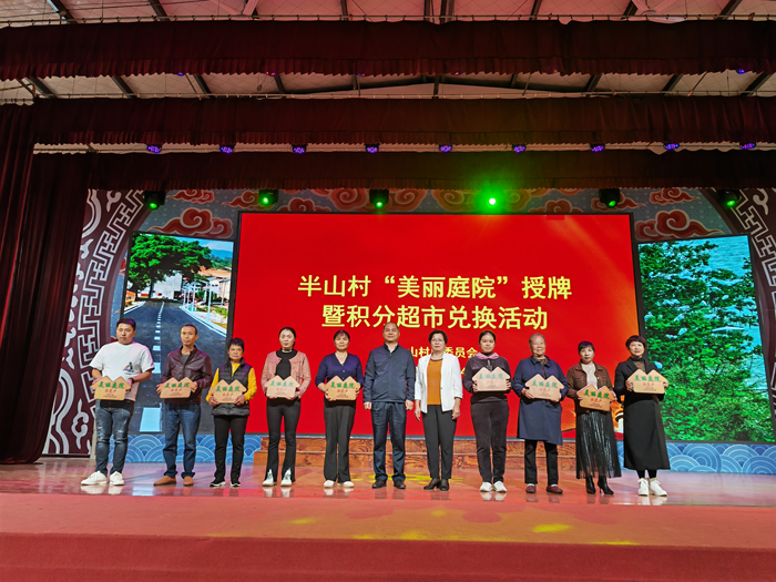 尤溪县着力打造半山村乡村振兴示范村,进一步发挥群众自治在推进乡风文明、助推乡村振兴中的独特作用,最大限度地激发群众投身“美丽庭院”创建热情,推动农村人居环境整治取得新成效。图为2022年11月24日,半山村文化礼堂举办“美丽庭院”授牌暨积分超市兑换活动。(地方媒体供图)