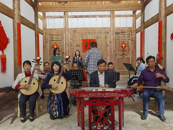 尤溪县“半山汶潭农民乐队”由半山、汶潭、经通、梅仙、南洋5个村庄村民自发组建,他们中有摩托车维修工、木工、机修工、光饼摊主、家庭主妇等,年龄最大的66岁,最小的50岁。图为2022年4月,“半山汶潭农民乐队”在新知青艺术公社开展日常排练活动。(地方媒体供图)