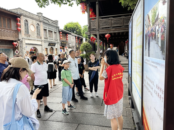 “爱心服务力量”全面下沉,大街小巷都有爱心志愿者的身影。图为7月21日,三坊七巷景区内,身穿”红马甲“的志愿者正在给游客介绍街区历史。新华网 于珊 摄