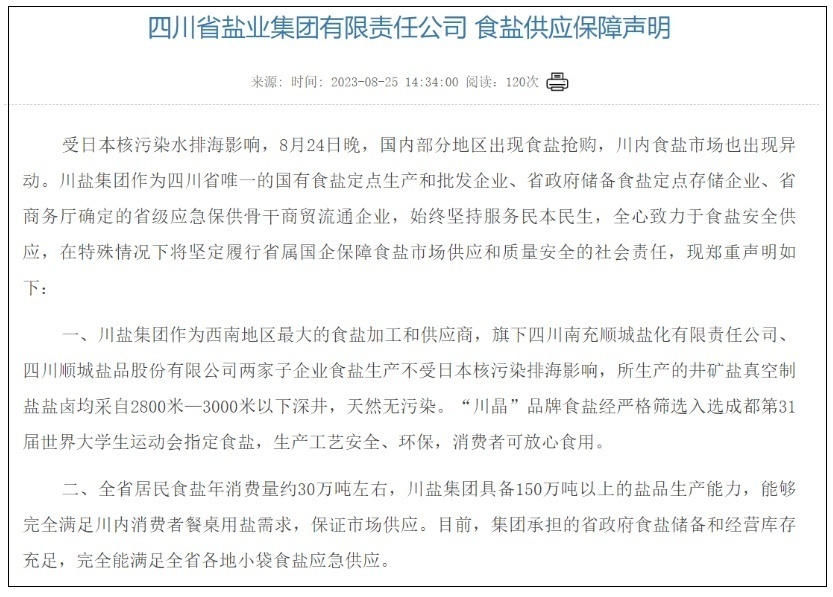 25日,四川省盐业集团有限责任公司发布食盐供应保障声明:川盐集团作为西南地区最大的食盐加工和供应商,旗下四川南充顺城盐化有限责任公司、四川顺城盐品股份有限公司两家子企业食盐生产不受日本核污染排海影响,所生产的井矿盐真空制盐盐卤均采自2800米—3000米以下深井,天然无污染。四川全省居民食盐年消费量约30万吨左右,川盐集团具备150万吨以上的盐品生产能力,能够完全满足川内消费者餐桌用盐需求,保证市场供应。